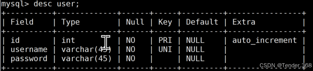 | username | varchar(45) | NO | UNI | NULL |