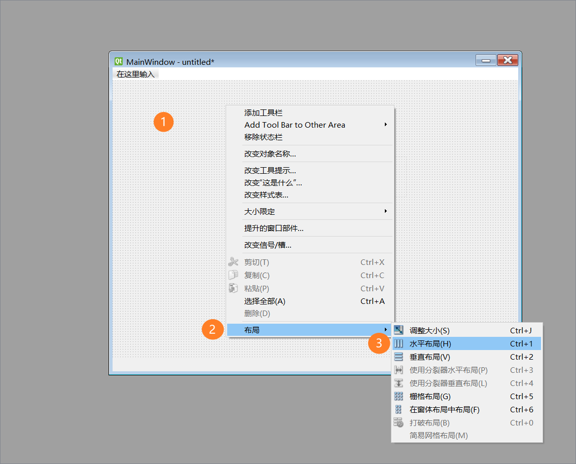 具体做法就是,将鼠标点击窗口中没有控件的空白处,再点击右键,设置水平布局就可以了。注意:不是灰色区域!步骤如下图所示: