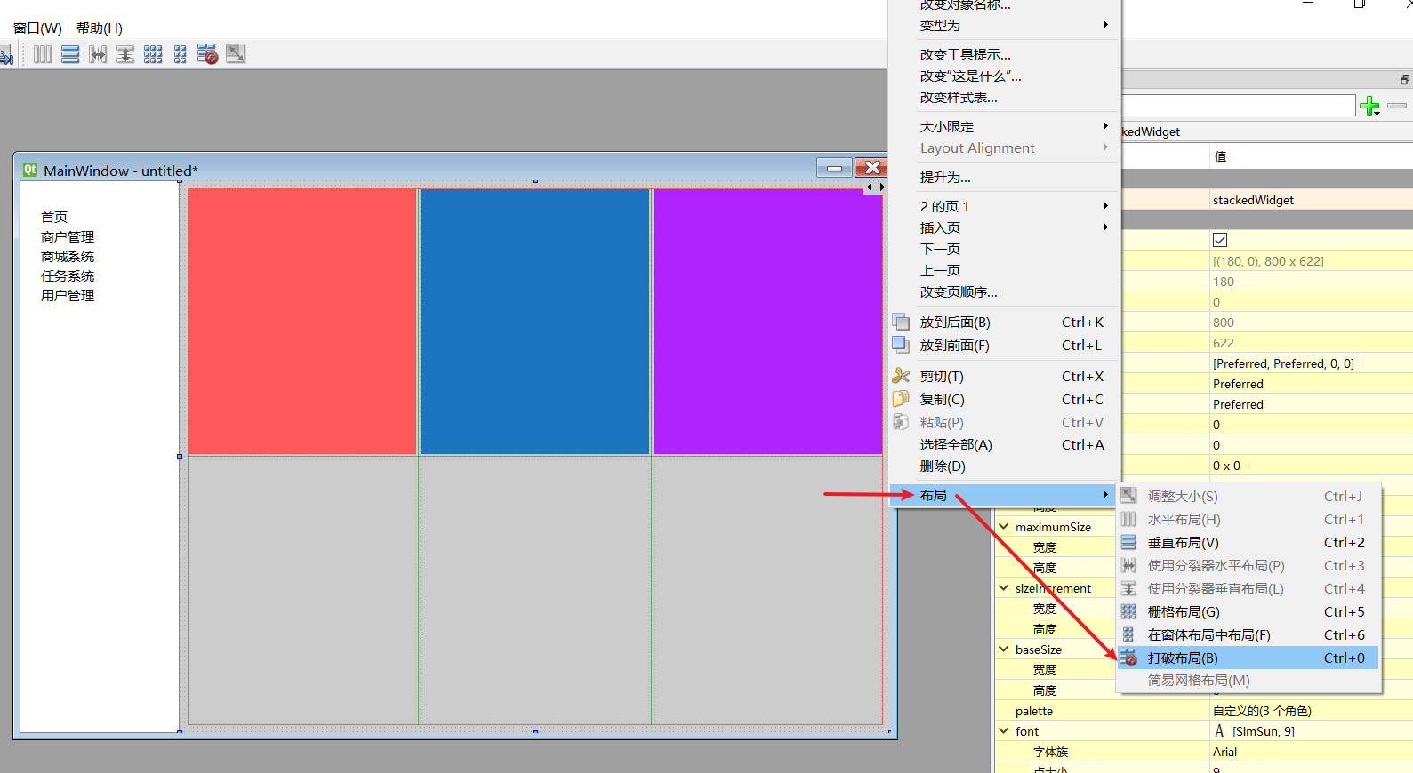 第2种,是打破布局,即删除当前窗口中所有的布局,然后再重新布局。操作方法:鼠标单击窗口空白处,点击鼠标右键,单击布局,找到打破布局再点击即可。如下图所示: