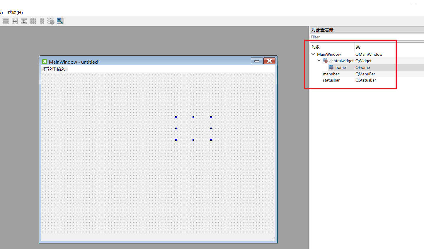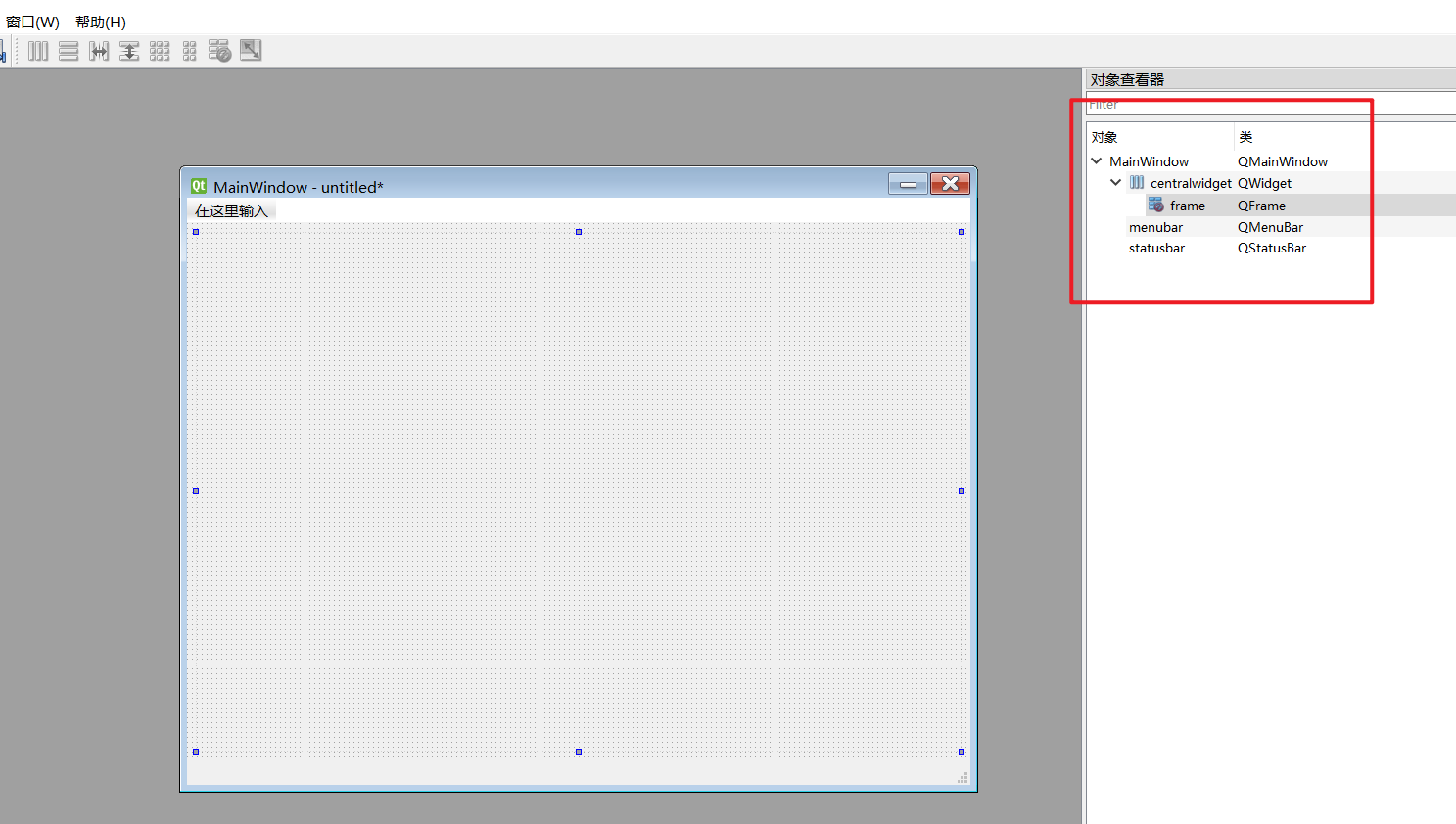 设置完成后,你就会发现,frame的大小直接和窗口大小一致了。再观察右侧对象查看器中,frame对象上面的centralwidget的布局图标是正常显示了,刚刚的红色禁止标志已经消失了。如下图所示: