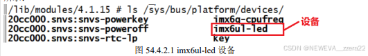 根文件系统中/sys/bus/platform/目录下保存着当前板子 platform 总线下的设备和驱动,其中 devices 子目录为 platform 设备,drivers 子目录为 plartofm 驱动。查看/sys/bus/platform/devices/ 目录,看看我们的设备是否存在,我们在 leddevice.c 中设置 leddevice(platform_device 类型)的 name 字段为“imx6ul-led”,也就是设备名字为 imx6ul-led,因此肯定在/sys/bus/platform/devices/ 目录下存在一个名字“imx6ul-led”的文件,否则说明我们的设备模块加载失败,结果如图 54.4.2.1