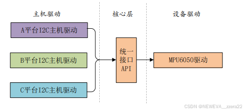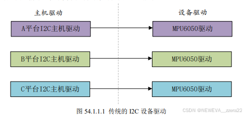 从图 54.1.1.1 可以看出,每种平台下都有一个主机驱动和设备驱动,主机驱动肯定是必须 要的,毕竟不同的平台其 I2C 控制器不同。但是右侧的设备驱动就没必要每个平台都写一个, 因为不管对于那个 SOC 来说,MPU6050 都是一样,通过 I2C 接口读写数据就行了,只需要一 个 MPU6050 的驱动程序即可。如果再来几个 I2C 设备,比如 AT24C02、FT5206(电容触摸屏) 等,如果按照图 54.1.1 中的写法,那么设备端的驱动将会重复的编写好几次。显然在 Linux 驱 动程序中这种写法是不推荐的,最好的做法就是每个平台的 I2C 控制器都提供一个统一的接口 (也叫做主机驱动),每个设备的话也只提供一个驱动程序(设备驱动),每个设备通过统一的 I2C 接口驱动来访问,这样就可以大大简化驱动文件,比如 54.1.1 中三种平台下的 MPU6050 驱动 框架就可以简化为图 54.1.1.2 所示: