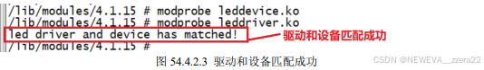 驱动模块和设备模块加载成功以后 platform 总线就会进行匹配,当驱动和设备匹配成功以 后就会输出如图 54.4.2.3 所示一行语句:
