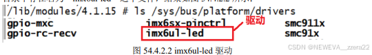 同理,查看/sys/bus/platform/drivers/目录,看一下驱动是否存在,我们在 leddriver.c 中设置 led_driver (platform_driver 类型)的 name 字段为“imx6ul-led”,因此会在/sys/bus/platform/drivers/ 目录下存在名为“imx6ul-led”这个文件,结果如图 54.4.2.2 所示: