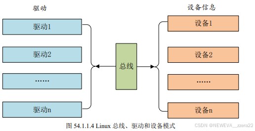 这个就是驱动的分隔,也就是将主机驱动和设备驱动分隔开来,比如 I2C、SPI 等等都会采 用驱动分隔的方式来简化驱动的开发。在实际的驱动开发中,一般 I2C 主机控制器驱动已经由 半导体厂家编写好了,而设备驱动一般也由设备器件的厂家编写好了,我们只需要提供设备信 息即可,比如 I2C 设备的话提供设备连接到了哪个 I2C 接口上,I2C 的速度是多少等等。相当 于将设备信息从设备驱动中剥离开来,驱动使用标准方法去获取到设备信息(比如从设备树中获 取到设备信息),然后根据获取到的设备信息来初始化设备。 这样就相当于驱动只负责驱动, 设备只负责设备,想办法将两者进行匹配即可。这个就是 Linux 中的总线(bus)、驱动(driver)和 设备(device)模型,也就是常说的驱动分离。总线就是驱动和设备信息的月老,负责给两者牵线 搭桥,如图 54.1.1.4 所示: