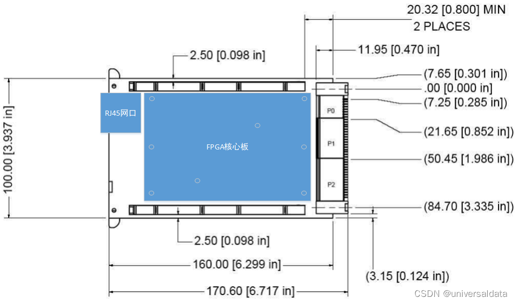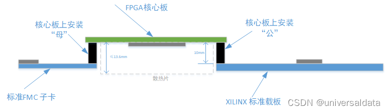 SOM-404为FPGA 690T的核心板,也可以单独供电使用,尺寸为80mm x 125mm,方便搭载3U VPX、3U PXIe等平台下使用。核心板上一个FMC+公插头,一个FMC+母插头,都满足VITA57.4、VITA57.1规范,即当SOM-404作为子卡时,可以插入到XILINX或AMD的载板上;当SOM-404作为载板时,标准的FMC子卡又可以插入到SOM-404上。