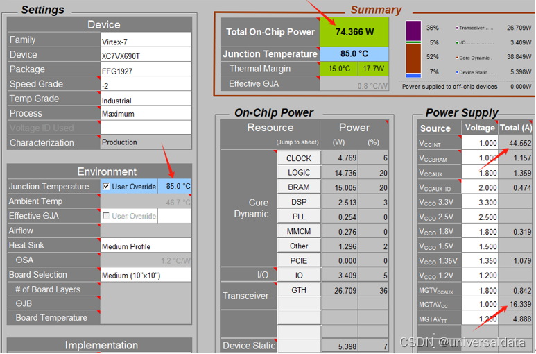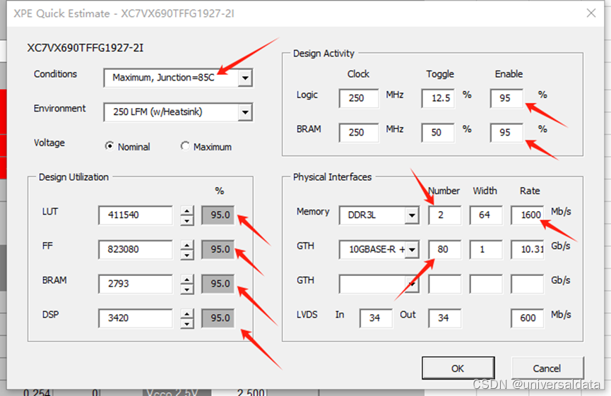 以上是在85度环境下,各资源量用到95%情况下,2组64bit的DDR3,80路GTH全部使用进行评估。评估的结果如下: