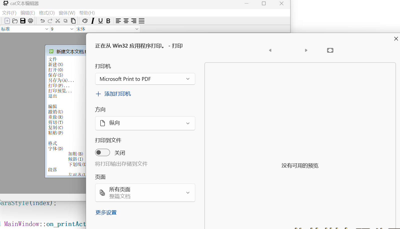 void MainWindow::on_printPreviewAction_triggered() { docPrintPreview(); } void MainWindow::docPrintPreview() { // 创建一个 QPrinter 对象 QPrinter pter; // 创建一个 QPrintPreviewDialog 对象,并将 pter 作为参数传递,同时设置父窗口为 this QPrintPreviewDialog preview(&pter,this); // 连接预览对话框的 paintRequested 信号到 MainWindow 的 printPreview 槽函数 connect(&preview,SIGNAL(paintRequested(QPrinter*)),this,SLOT(printPreview(QPrinter*))); // 显示打印预览对话框 preview.exec(); //每当预览对话框需要绘制预览时,都会触发 paintRequested 信号,从而调用 printPreview 槽函数 } void MainWindow::printPreview(QPrinter *printer) { activateChildWnd()->print(printer); }
