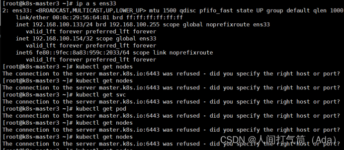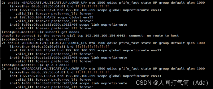 3、当一台可以查看nodes节点的master宕机之后,其余两台随机一台获取vip,然后可以观察nodes节点,但是当超过两台master宕机之后,集群需重建才可以观察nodes节点,但服务未停止;当两台宕机主机回复之后,服务停止,node节点不可观察,集群停止,需重建!