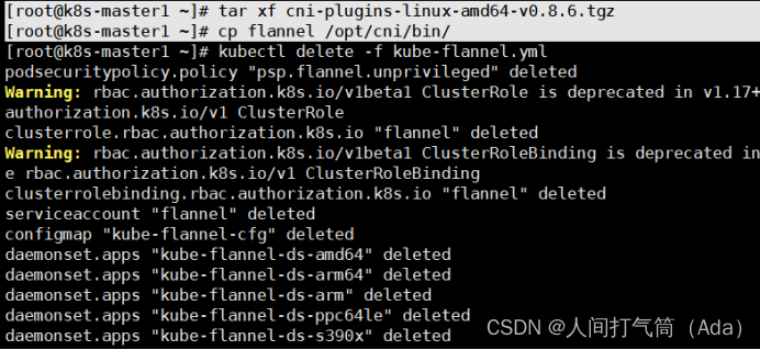 [root@k8s-master1 ~]# kubectl delete -f kube-flannel.yml 删除之前的apply操作