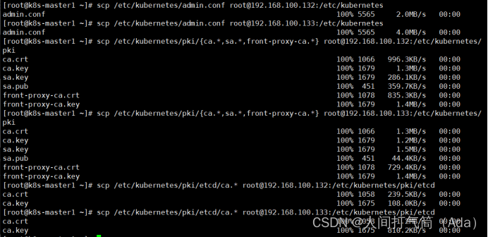 [root@k8s-master1 ~]# scp /etc/kubernetes/pki/etcd/ca.* root@192.168.100.132:/etc/kubernetes/pki/etcd