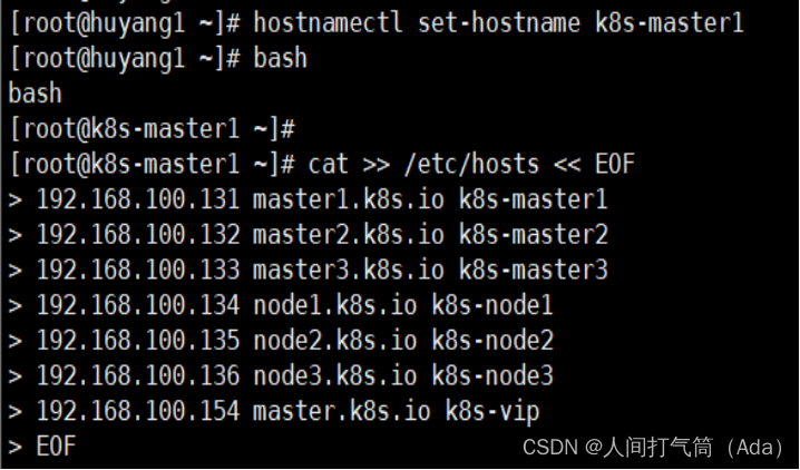 [root@k8s-master1 ~]# cat >> /etc/hosts << EOF 192.168.100.131 master1.k8s.io k8s-master1 192.168.100.132 master2.k8s.io k8s-master2 192.168.100.133 master3.k8s.io k8s-master3 192.168.100.134 node1.k8s.io k8s-node1 192.168.100.135 node2.k8s.io k8s-node2 192.168.100.136 node3.k8s.io k8s-node3 192.168.100.154 master.k8s.io k8s-vip EOF