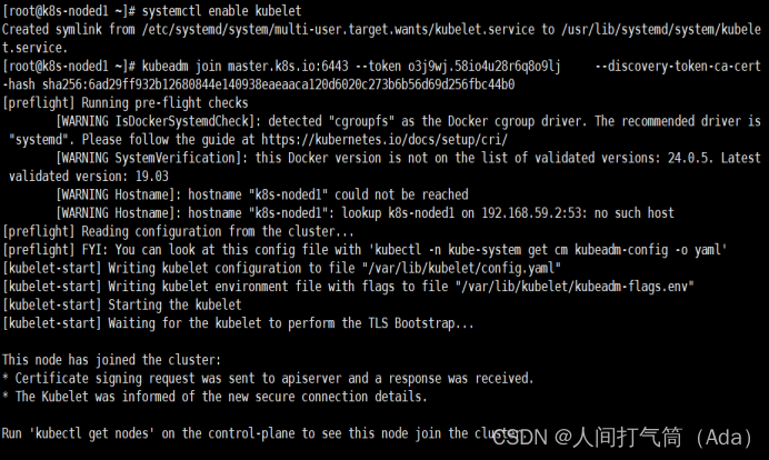 [root@k8s-node1 ~]# kubeadm join master.k8s.io:6443 --token o3j9wj.58io4u28r6q8o9lj --discovery-token-ca-cert-hash sha256:6ad29ff932b12680844e140938eaeaaca120d6020c273b6b56d69d256fbc44b0