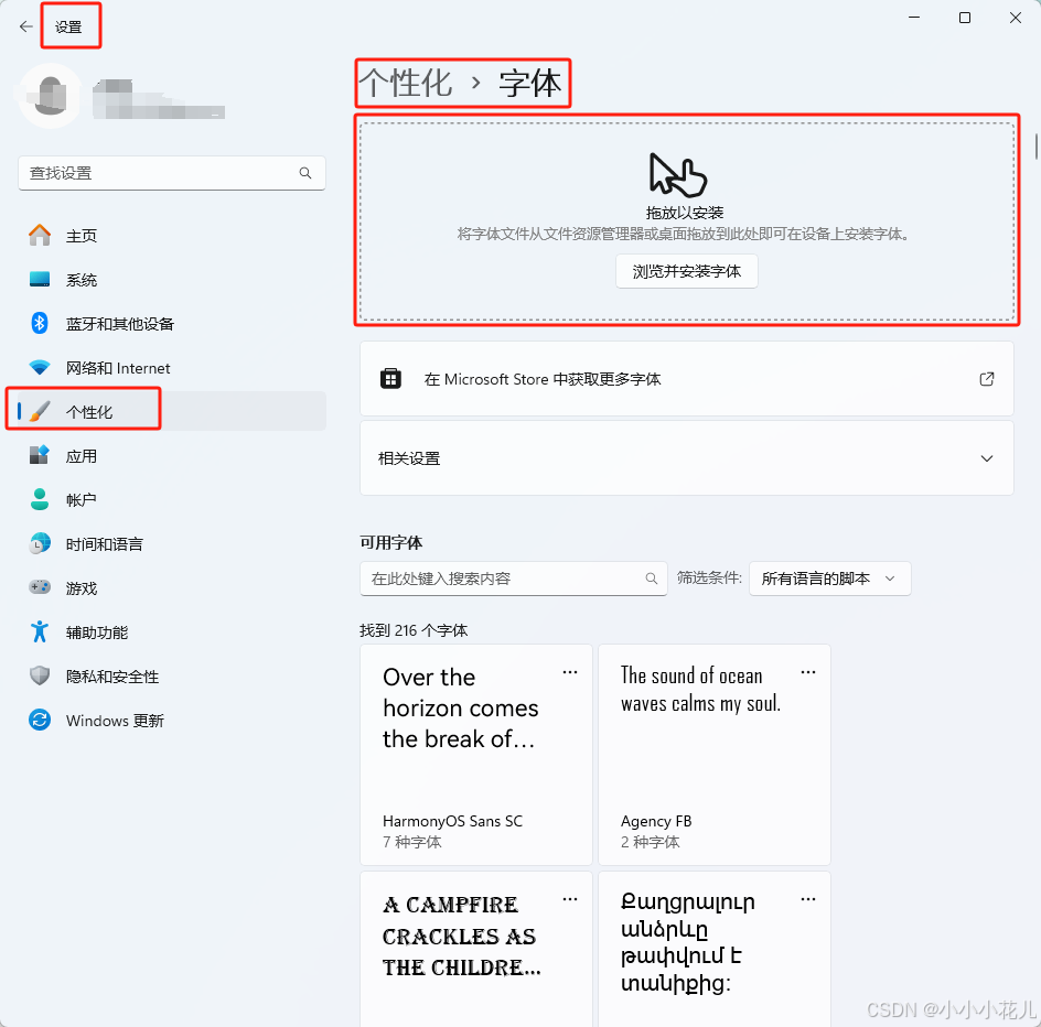 然后将里面的HarmonyOS_Sans_SC_Regular.ttf直接拖进设置 --> 个性化 --> 字体安装即可
