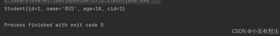 public class StudentMapperTest extends TestCase { public void testSelectStudentById() { SqlSession session= MyBatisUtils.getSession(); StudentMapper studentMapper= session.getMapper(StudentMapper.class); Student student= studentMapper.selectStudentById(2); System.out.println(student); session.close(); } }