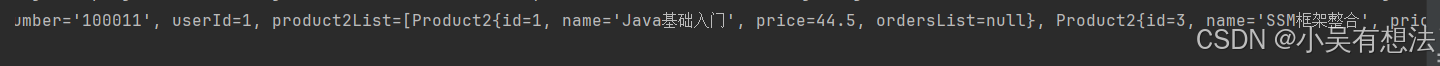 public class Orders { private int id; private String number; private int userId; private Listproduct2List; @Override public String toString() { return "Orders{" + "id=" + id + ", number='" + number + '\'' + ", userId=" + userId + ", product2List=" + product2List + '}'; } public int getId() { return id; } public void setId(int id) { this.id = id; } public String getNumber() { return number; } public void setNumber(String number) { this.number = number; } public int getUserId() { return userId; } public void setUserId(int userId) { this.userId = userId; } }
