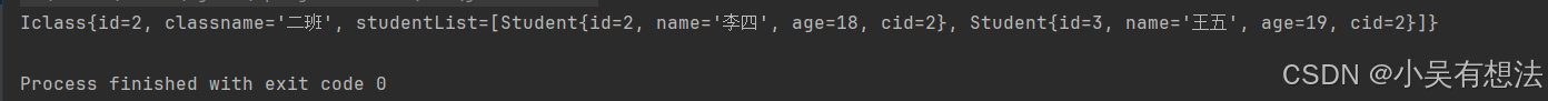@Select("select * from class where id=#{id}") @Results({ @Result(id = true,column = "id",property = "id"), @Result(property = "classname",column = "classname"), @Result(property = "studentList", column = "id", many =@Many(select = "com.it.dao.StudentMapper.selectStudentsByCid") ) }) public Iclass selectClassById(int id);