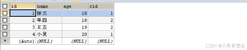 CREATE TABLE student( id INT PRIMARY KEY AUTO_INCREMENT, NAME VARCHAR(20), age INT, cid INT ); INSERT INTO student VALUES(1,'张三',18,1); INSERT INTO student VALUES(2,'李四',18,2); INSERT INTO student VALUES(3,'王五',19,2); INSERT INTO student VALUES(4,'赵六',20,1); CREATE TABLE class( id INT PRIMARY KEY AUTO_INCREMENT, classname VARCHAR(20) ); INSERT INTO class VALUES(1,'一班'); INSERT INTO class VALUES(2,'二班');