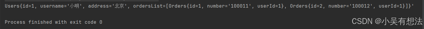 public class Users { private int id; private String username; private String address; private List ordersList; @Override public String toString() { return "Users{" + "id=" + id + ", username='" + username + '\'' + ", address='" + address + '\'' + ", ordersList=" + ordersList + '}'; } public int getId() { return id; } public void setId(int id) { this.id = id; } public String getUsername() { return username; } public void setUsername(String username) { this.username = username; } public String getAddress() { return address; } public void setAddress(String address) { this.address = address; } }