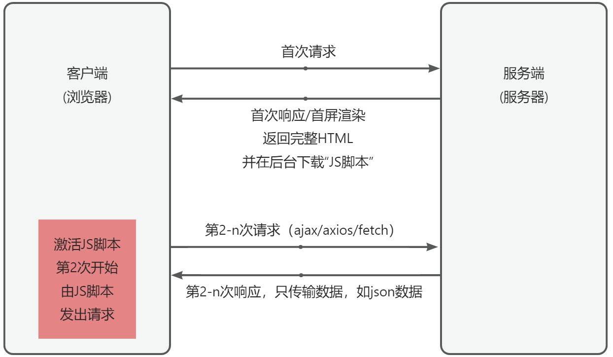 如下图所示,同构渲染的首次请求,返回请求页面的完整HTML,可以解决客户端渲染“首屏渲染慢、SEO无法优化”的问题。之后的请求,由客户端直接发起ajax/axios/fetch请求,只返回数据,且页面只在客户端路由内跳转,可以解决传统服务端渲染“服务器压力大,带宽消耗大”的问题。就目前Web的技术发展来说,是相对平衡的最佳选择。