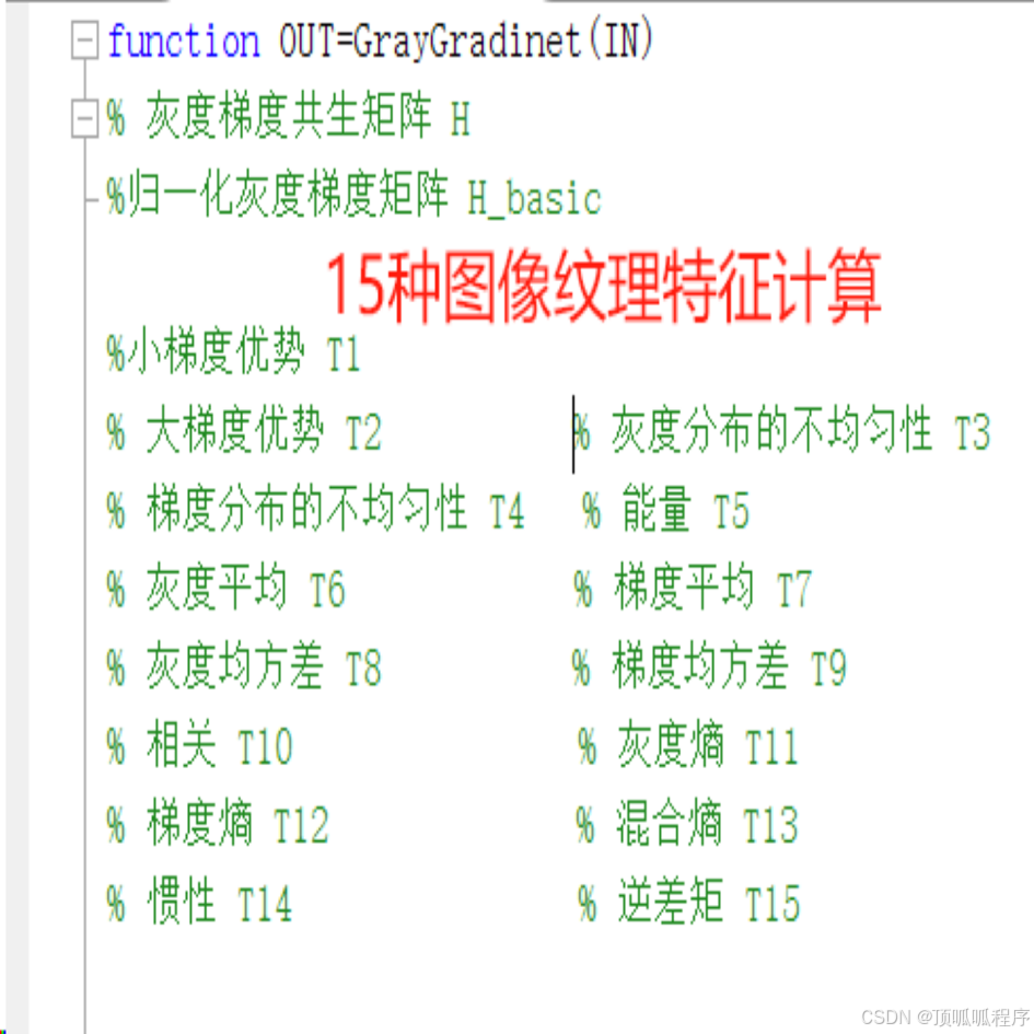 基于matlab的15种图像纹理特征计算。纹理特征包括小梯度优势 T1、大梯度优势 T2、 灰度分布的不均匀性 T3、 梯度分布的不均匀性 T4 、能量 T5、灰度平均 T6、梯度平均 T7、灰度均方差 T8 、梯度均方差 T9、相关 T10 、灰度熵 T11、梯度熵 T12 、 混合熵 T13、惯性 T14 、 逆差矩 T15。程序已调通,可直接运行。