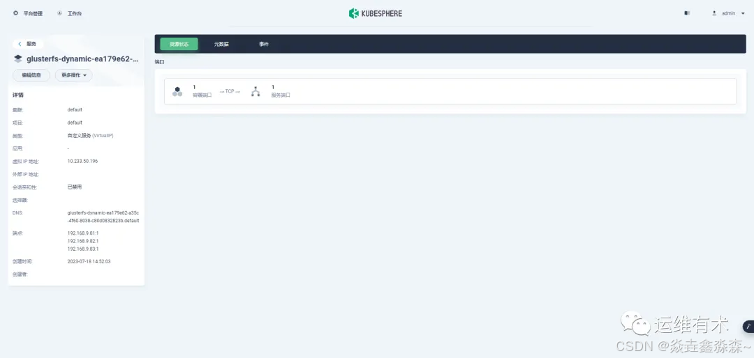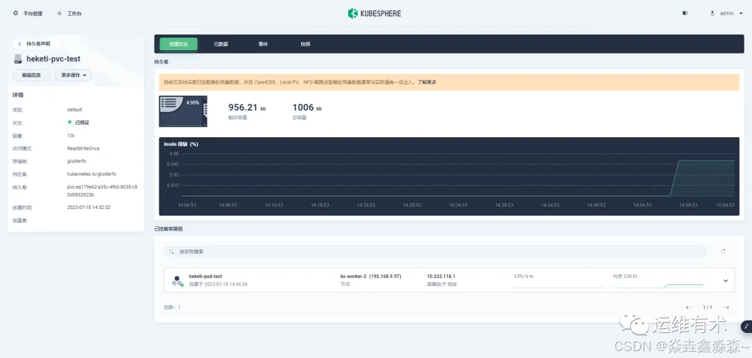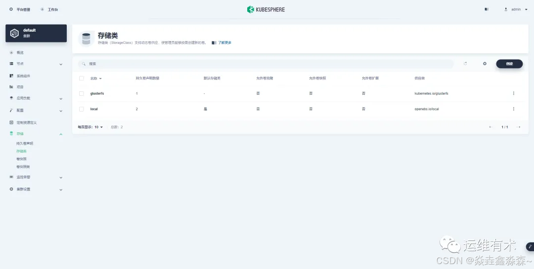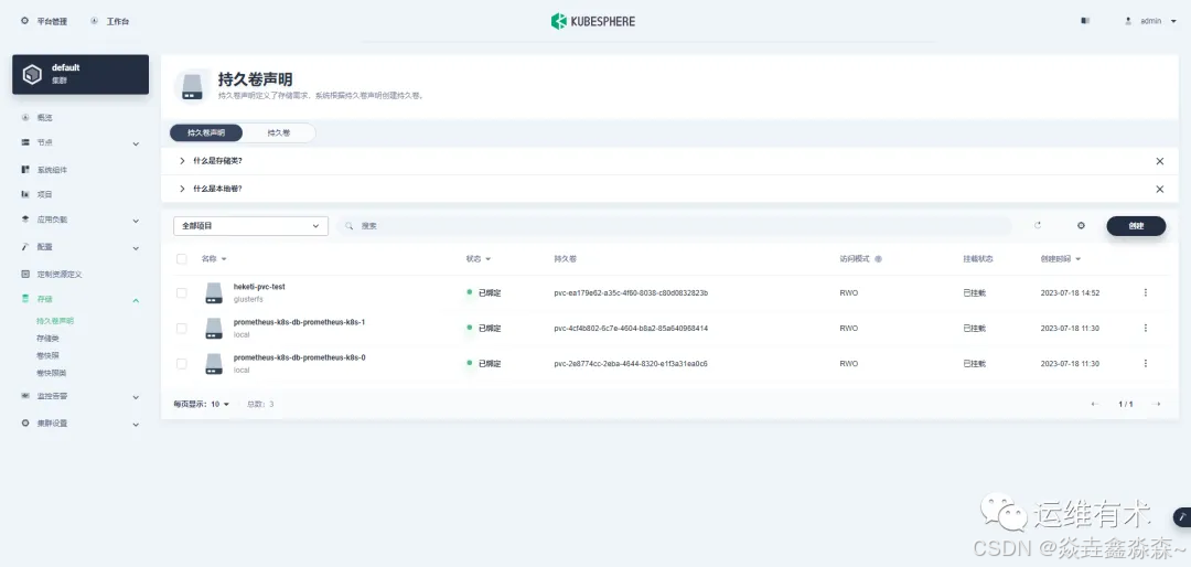 接下来我们看几张图,看一下在底层创建的存储资源在 KubeSphere 管理控制台中能展示哪些,又是如何展示的?