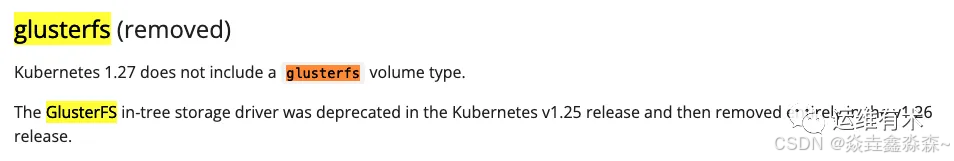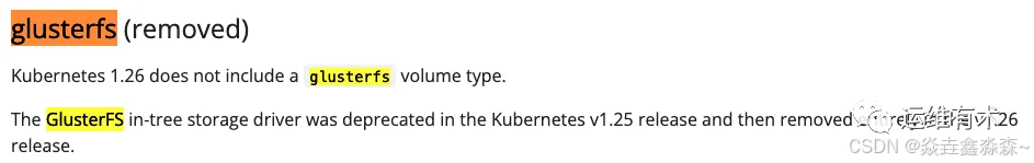 通过上面的图可以看出,Kubernet v1.24、v1.25 还是可以使用 GlusterFS的,到了 v1.26 开始 已经无法使用 in-tree storage driver 的方式使用 GlusterFS 存储。