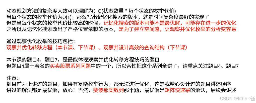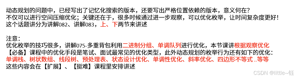 public class Code03_Stock3 { // 完全不优化枚举的方法 // 通过不了,会超时 public static int maxProfit1(int[] prices) { int n = prices.length; // dp1[i] : 0...i范围上发生一次交易,不要求在i的时刻卖出,最大利润是多少 int[] dp1 = new int[n]; for (int i = 1, min = prices[0]; i < n; i++) { min = Math.min(min, prices[i]); dp1[i] = Math.max(dp1[i - 1], prices[i] - min); } // dp2[i] : 0...i范围上发生两次交易,并且第二次交易在i时刻卖出,最大利润是多少 int[] dp2 = new int[n]; int ans = 0; for (int i = 1; i < n; i++) { // 第二次交易一定要在i时刻卖出 for (int j = 0; j <= i; j++) { // 枚举第二次交易的买入时机j <= i dp2[i] = Math.max(dp2[i], dp1[j] + prices[i] - prices[j]); } ans = Math.max(ans, dp2[i]); } return ans; } // 观察出优化枚举的方法 // 引入best数组,需要分析能力 public static int maxProfit2(int[] prices) { int n = prices.length; // dp1[i] : 0...i范围上发生一次交易,不要求在i的时刻卖出,最大利润是多少 int[] dp1 = new int[n]; for (int i = 1, min = prices[0]; i < n; i++) { min = Math.min(min, prices[i]); dp1[i] = Math.max(dp1[i - 1], prices[i] - min); } // best[i] : 0...i范围上,所有的dp1[i]-prices[i],最大值是多少 // 这是数组的设置完全是为了替代最后for循环的枚举行为 int[] best = new int[n]; best[0] = dp1[0] - prices[0]; for (int i = 1; i < n; i++) { best[i] = Math.max(best[i - 1], dp1[i] - prices[i]); } // dp2[i] : 0...i范围上发生两次交易,并且第二次交易在i时刻卖出,最大利润是多少 int[] dp2 = new int[n]; int ans = 0; for (int i = 1; i < n; i++) { // 不需要枚举了 // 因为,best[i]已经揭示了,0...i范围上,所有的dp1[i]-prices[i],最大值是多少 dp2[i] = best[i] + prices[i]; ans = Math.max(ans, dp2[i]); } return ans; } // 发现所有更新行为都可以放在一起 // 并不需要写多个并列的for循环 // 就是等义改写,不需要分析能力 public static int maxProfit3(int[] prices) { int n = prices.length; int[] dp1 = new int[n]; int[] best = new int[n]; best[0] = -prices[0]; int[] dp2 = new int[n]; int ans = 0; for (int i = 1, min = prices[0]; i < n; i++) { min = Math.min(min, prices[i]); dp1[i] = Math.max(dp1[i - 1], prices[i] - min); best[i] = Math.max(best[i - 1], dp1[i] - prices[i]); dp2[i] = best[i] + prices[i]; ans = Math.max(ans, dp2[i]); } return ans; } // 发现只需要有限几个变量滚动更新下去就可以了 // 空间压缩的版本 // 就是等义改写,不需要分析能力 public static int maxProfit4(int[] prices) { int dp1 = 0; int best = -prices[0]; int ans = 0; for (int i = 1, min = prices[0]; i < prices.length; i++) { min = Math.min(min, prices[i]); dp1 = Math.max(dp1, prices[i] - min); best = Math.max(best, dp1 - prices[i]); ans = Math.max(ans, best + prices[i]); // ans = Math.max(ans, dp2); } return ans; } }
