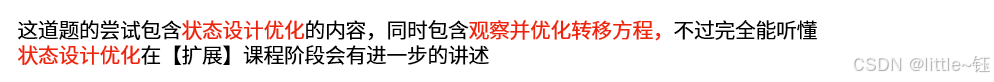 public class Solution { public static int numPermsDISequence1(String s) { return f(s.toCharArray(), 0, s.length() + 1, s.length() + 1); } // 猜法很妙! // 一共有n个数字,位置范围0~n-1 // 当前来到i位置,i-1位置的数字已经确定,i位置的数字还没确定 // i-1位置和i位置的关系,是s[i-1] : D、I // 0~i-1范围上是已经使用过的数字,i个 // 还没有使用过的数字中,比i-1位置的数字小的,有less个 // 还没有使用过的数字中,比i-1位置的数字大的,有n - i - less个 // 返回后续还有多少种有效的排列 public static int f(char[] s, int i, int less, int n) { int ans = 0; if (i == n) { ans = 1; } else if (i == 0 || s[i - 1] == 'D') { for (int nextLess = 0; nextLess < less; nextLess++) { ans += f(s, i + 1, nextLess, n); } } else { for (int nextLess = less, k = 1; k <= n - i - less; k++, nextLess++) { ans += f(s, i + 1, nextLess, n); } } return ans; } public static int numPermsDISequence2(String str) { int mod = 1000000007; char[] s = str.toCharArray(); int n = s.length + 1; int[][] dp = new int[n + 1][n + 1]; for (int less = 0; less <= n; less++) { dp[n][less] = 1; } for (int i = n - 1; i >= 0; i--) { for (int less = 0; less <= n; less++) { if (i == 0 || s[i - 1] == 'D') { for (int nextLess = 0; nextLess < less; nextLess++) { dp[i][less] = (dp[i][less] + dp[i + 1][nextLess]) % mod; } } else { for (int nextLess = less, k = 1; k <= n - i - less; k++, nextLess++) { dp[i][less] = (dp[i][less] + dp[i + 1][nextLess]) % mod; } } } } return dp[0][n]; } // 通过观察方法2,得到优化枚举的方法 public static int numPermsDISequence(String str) { int mod = 1000000007; char[] s = str.toCharArray(); int n = s.length + 1; int[][] dp = new int[n + 1][n + 1]; for (int less = 0; less <= n; less++) { dp[n][less] = 1; } for (int i = n - 1; i >= 0; i--) { if (i == 0 || s[i - 1] == 'D') { dp[i][1] = dp[i + 1][0]; for (int less = 2; less <= n; less++) { dp[i][less] = (dp[i][less - 1] + dp[i + 1][less - 1]) % mod; } } else { dp[i][n - i - 1] = dp[i + 1][n - i - 1]; for (int less = n - i - 2; less >= 0; less--) { dp[i][less] = (dp[i][less + 1] + dp[i + 1][less]) % mod; } } } return dp[0][n]; } }