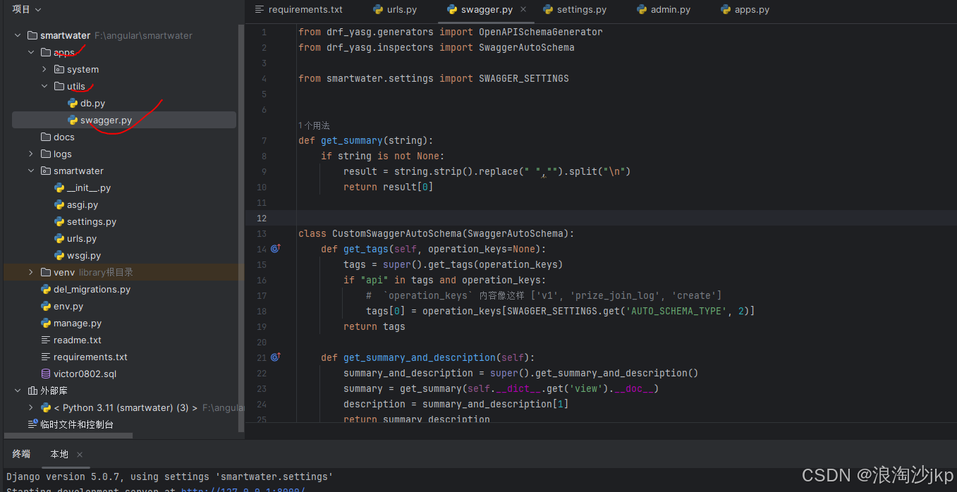 from drf_yasg.generators import OpenAPISchemaGenerator from drf_yasg.inspectors import SwaggerAutoSchema from smartwater.settings import SWAGGER_SETTINGS def get_summary(string): if string is not None: result = string.strip().replace(" ","").split("\n") return result[0] class CustomSwaggerAutoSchema(SwaggerAutoSchema): def get_tags(self, operation_keys=None): tags = super().get_tags(operation_keys) if "api" in tags and operation_keys: # `operation_keys` 内容像这样 ['v1', 'prize_join_log', 'create'] tags[0] = operation_keys[SWAGGER_SETTINGS.get('AUTO_SCHEMA_TYPE', 2)] return tags def get_summary_and_description(self): summary_and_description = super().get_summary_and_description() summary = get_summary(self.__dict__.get('view').__doc__) description = summary_and_description[1] return summary,description class CustomOpenAPISchemaGenerator(OpenAPISchemaGenerator): def get_schema(self, request=None, public=False): """Generate a :class:`.Swagger` object with custom tags""" swagger = super().get_schema(request, public) swagger.tags = [ { "name": "token", "description": "认证相关" }, ] return swagger