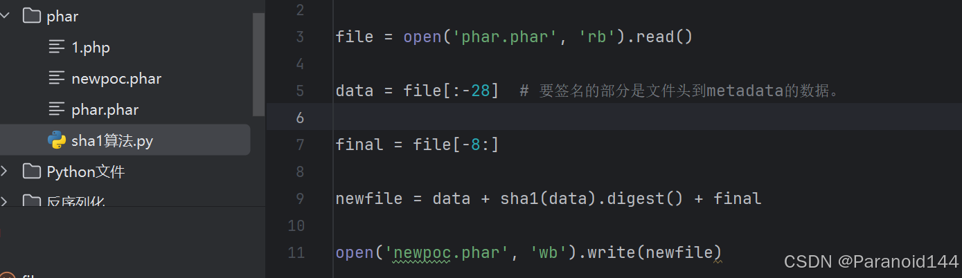 from hashlib import sha1 file = open('phar.phar', 'rb').read() data = file[:-28]#要签名的部分是文件头到metadata的数据。 final = file[-8:] newfile = data+sha1(data).digest()+final open('newpoc.phar', 'wb').write(newfile)