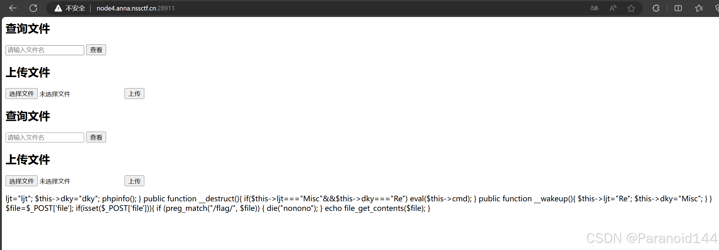 ljt="ljt"; $this->dky="dky"; phpinfo(); } public function __destruct(){ if($this->ljt==="Misc"&&$this->dky==="Re") eval($this->cmd); } public function __wakeup(){ $this->ljt="Re"; $this->dky="Misc"; } } $file=$_POST['file']; if(isset($_POST['file'])){ if (preg_match("/flag/", $file)) { die("nonono"); } echo file_get_contents($file); }