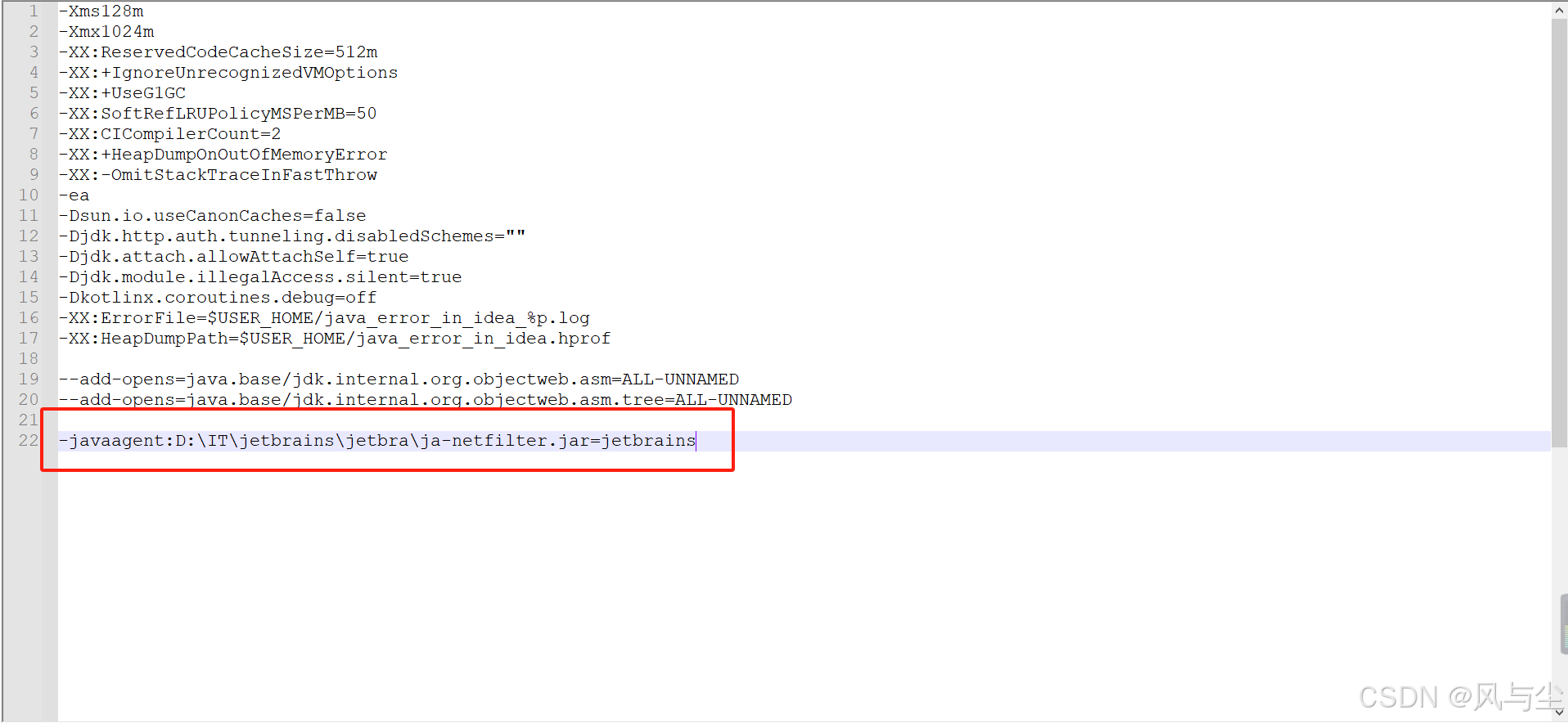 配置文件内容中主要是新增了一行代码,如果遇到问题,可以尝试将如下的代码配置到idea默认的配置文件中,默认配置文件为 IntelliJ IDEA 2024.1.4\bin\idea64.exe.vmoptions