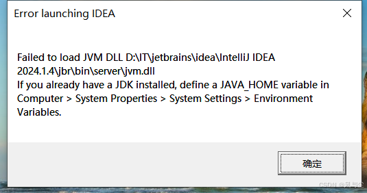 idea启动报错:(Failed to load JVM DLL D:\lT\jetbrains\idea\lntelliJ IDEA 2024.1.4\jbr\bin\server\jvm.dll If you already have a JDK installed, define a JAVA HOME variable in Computer > System Propefties > System Settings > Environment Variables.)