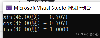 #define _CRT_SECURE_NO_WARNINGS 1 #include #include #ifndef M_PI #define M_PI 3.14159265358979323846 #endif int main() { float angle = 45.0f; float radians = angle * M_PI / 180.0f; // 将角度转换为弧度,M_PI是π float sin_value = sinf(radians); float cos_value = cosf(radians); float tan_value = tanf(radians); printf("sin(%.2f度) = %.4f\n", angle, sin_value); printf("cos(%.2f度) = %.4f\n", angle, cos_value); printf("tan(%.2f度) = %.4f\n", angle, tan_value); return 0; }
