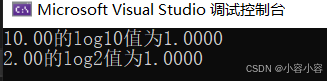 #define _CRT_SECURE_NO_WARNINGS 1 #include #include int main() { double num = 10.0; double num2 = 2.0; double log_value = log10(num); double log_value2 = log2(num2); printf("%.2f的log10值为%.4f\n", num, log_value); printf("%.2f的log2值为%.4f\n", num2, log_value2); return 0; }