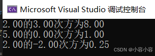 #include #include int main() { double base = 2.0; double exponent = 3.0; double result = pow(base, exponent); printf("%.2f的%.2f次方为%.2f\n", base, exponent, result); base = 5.0; exponent = 0.0; result = pow(base, exponent); printf("%.2f的%.2f次方为%.2f\n", base, exponent, result); base = 2.0; exponent = -2.0; result = pow(base, exponent); printf("%.2f的%.2f次方为%.2f\n", base, exponent, result); return 0; }