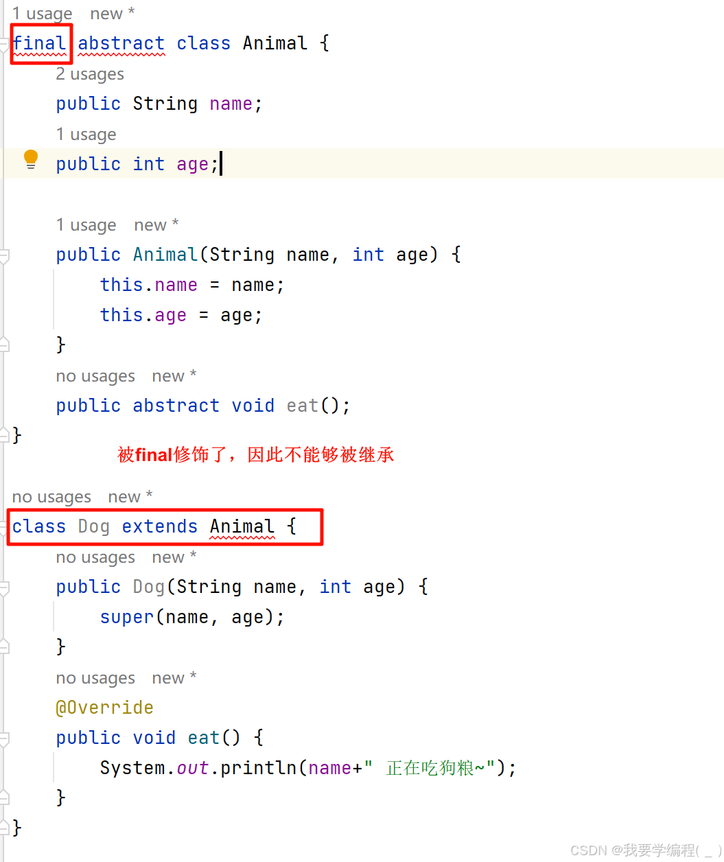 2、如果Dog类想成为最后一级类的话(就是不想还有其他类继承Dog类的话),只能用关键字 non-sealed 和 final 修饰。这两种修饰的意义不同:non-sealed 修饰代表的是这个类没有限制,也就类似于开放这个类的意思;而 final 修饰代表的是这个类不可被继承的类。其实也就是处理两种极限问题:可以让所有类继承它,没有类能够继承它。