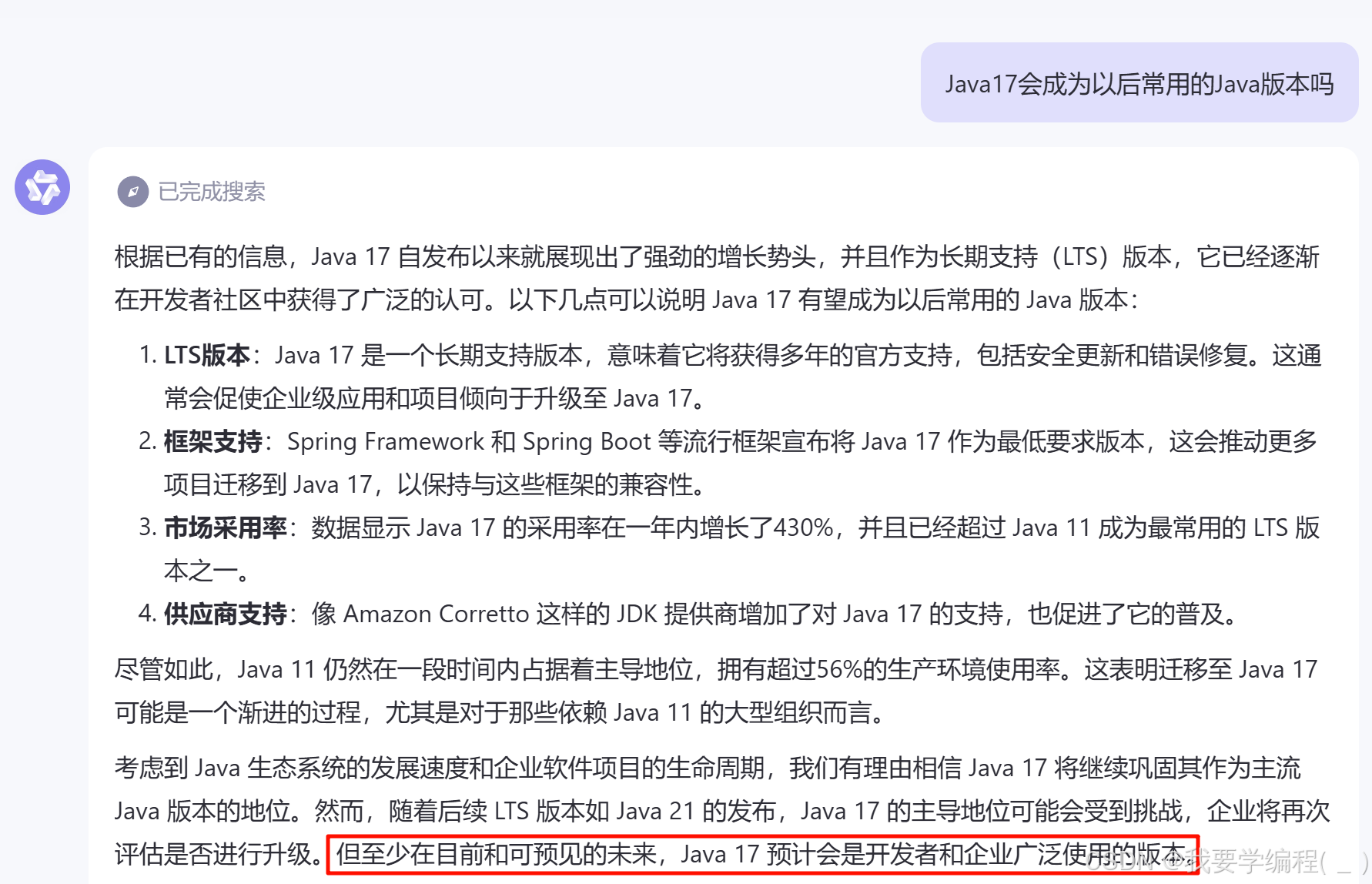 上面是 AI对 有关Java17是否会成为以后常用的开发版本 的看法。也许在不久的将来就会代替Java11成为新的常用开发版本,因此我们程序员也要开始学习Java17的相关语法变动。