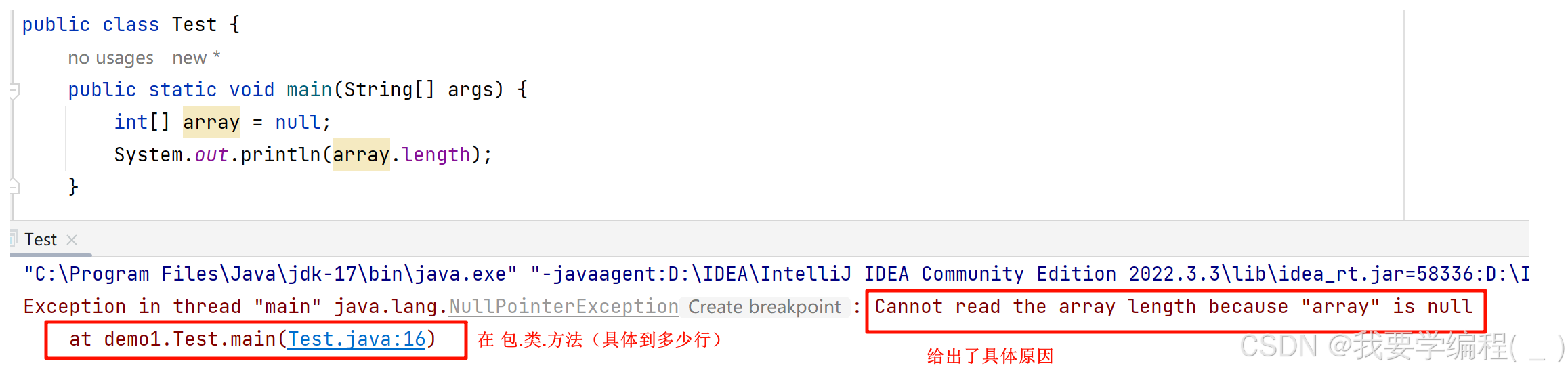 对于空指针异常的抛出,Java 8 只会给出哪里抛出了空指针异常,而没有把为什么会出现空指针异常告诉我们。Java 17就改善了这个方面。下面给出了两者对于空指针的异常的抛出示例: