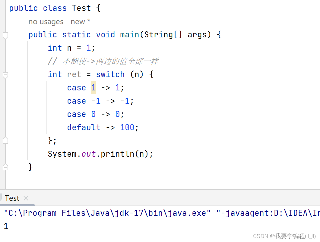 public class Test { public static void main(String[] args) { int n = 1; // 不能使->两边的值全部一样 int ret = switch (n) { case 1 -> 1; case -1 -> -1; case 0 -> 0; default -> 100; }; System.out.println(n); } }