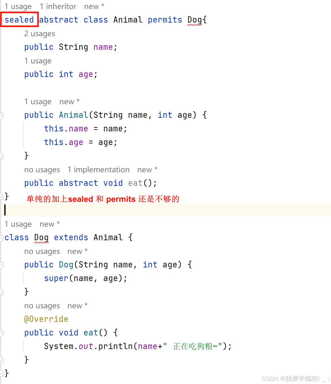 sealed abstract class Animal permits Dog{ public String name; public int age; public Animal(String name, int age) { this.name = name; this.age = age; } public abstract void eat(); } sealed class Dog extends Animal permits PetDog{ public Dog(String name, int age) { super(name, age); } @Override public void eat() { System.out.println(name+" 正在吃狗粮~"); } } non-sealed class PetDog extends Dog{ public PetDog(String name, int age) { super(name, age); } }
