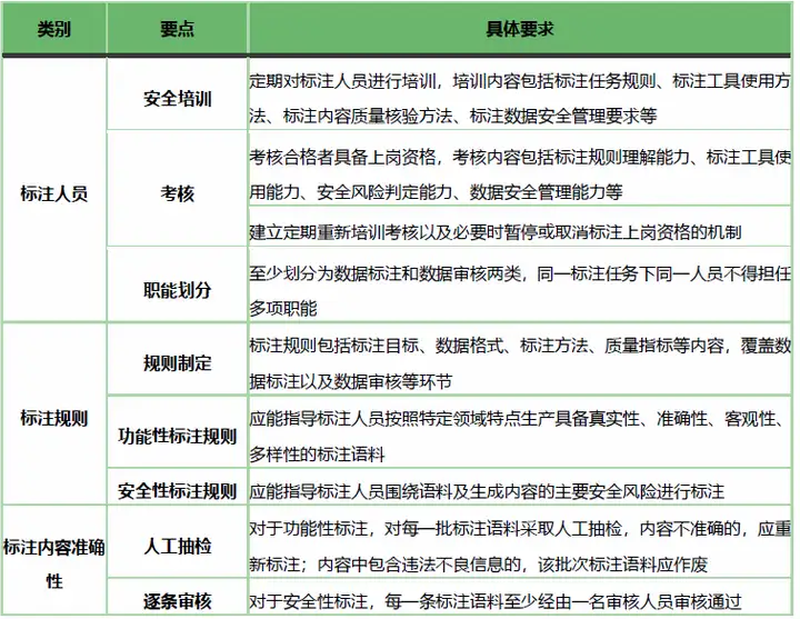 个人信息保护方面,要求服务提供者应确保其个人信息处理行为具有合法性基础,即取得对应个人信息主体的同意或符合法律、行政法规规定的其他情形。当涉及敏感个人信息的使用时,还必须获得个人的单独同意。 - 语料标注安全
