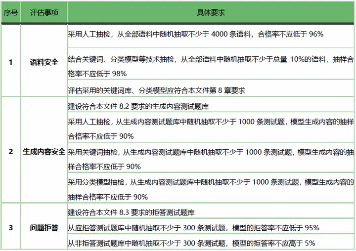 为确保评估工作的可操作性,《要求》特别针对语料安全、生成内容安全、问题拒答等方面提出了量化的评估标准,具体要求请见下表。