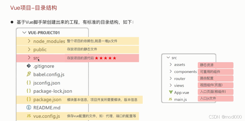 src中 APP.vue(以前的页面是.html结尾的,脚手架中都是以.vue结尾,没有.html文件了) 代表的就是页面,这里也称组件。是vue已经定义好的组件;views中则是用户自定义的组件。main.js、App.vue、views、router四个文件(夹)重点关注。