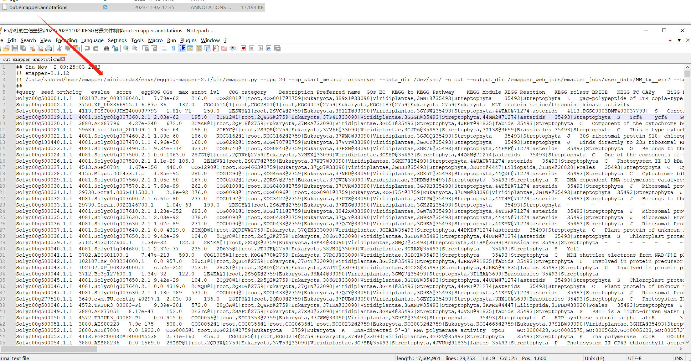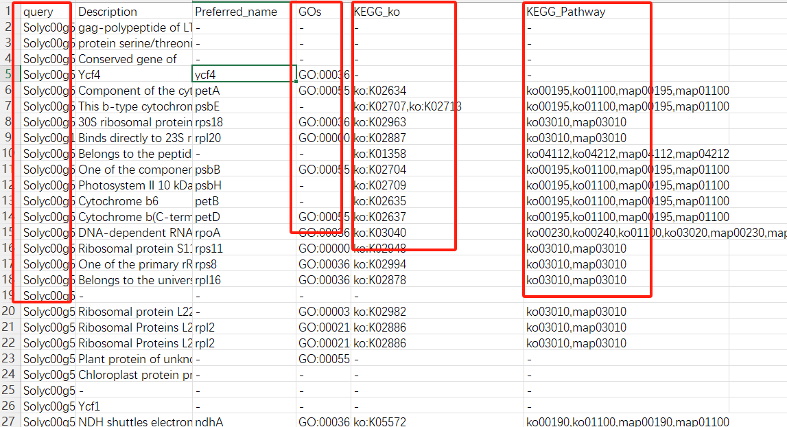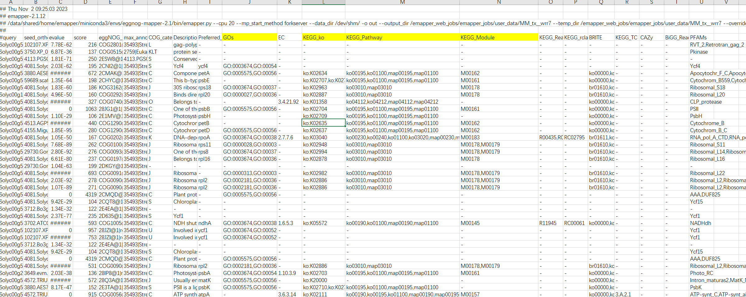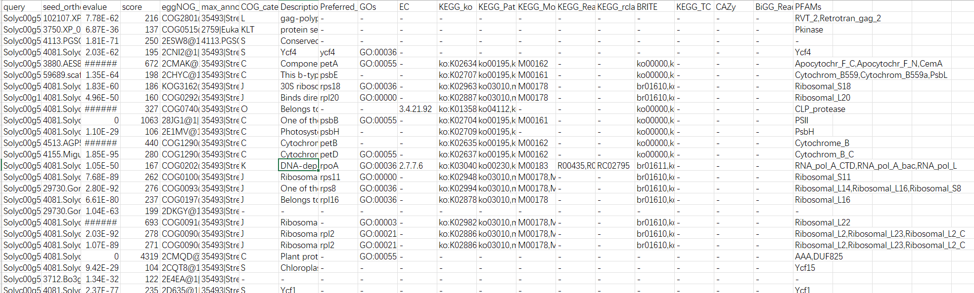 第一列:查询序列名称 第二列:eggNOG种子序列 第三列:eggNOG种子序列 evalue 第四列:eggNOG种子序列 bit score 第五列:匹配的OGs 第六列:最大的OG分类等级 第七列:COG功能分类 第八列:OGs最低分类等级物种描述 第九列:首选名称 第十列:GOs, 预测的GO,逗号分隔 第十一列:EC,预测额EC 第十二列:KEGG_KO: 预测的KO 第十三列:KEGG_Pathway:预测的ko通路 第十四列:KEGG_Module:预测的ko功能单元 第十五列:KEGG_Reaction:预测的酶促反应 第十六列:KEGG_rclass:预测的ko相关类 第十七列:BRITE:预测的brite功能分类 第十八列:KEGG_TC 第十九列:CAZy:预测的碳水化合物活性酶 第二十列:BiGG_Reaction:BiGG代谢反应预测 第二十一列:PFAMs:pfam蛋白预测