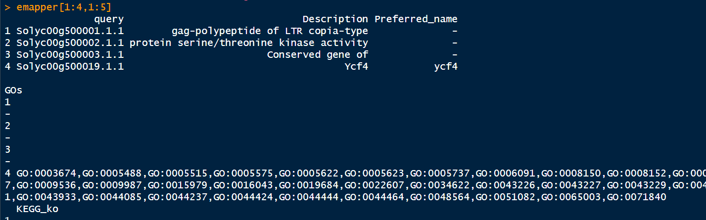 gene_info <- emapper %>% dplyr::select(GID = query,GENENAME = Preferred_name) %>% na.omit() gos <- emapper %>% dplyr::select(query, GOs) %>% na.omit() head(gos)