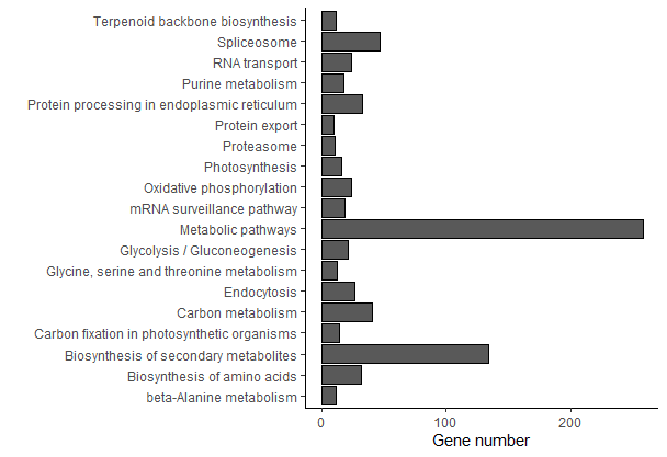 KEGG.data <- read.csv("KEGG_Enrichment_plotdata.csv", header = T) names(KEGG.data) <- c("Term","ID","number", "Backgroundnumber","Richfactor","P_value", "Corr_PValue") head(KEGG.data) ggplot(KEGG.data, aes(x = number, y = Term))+ geom_bar(stat = "identity", position = "dodge", color = "black")+ xlab("Gene number")+ ylab("")+ theme_classic()+theme(legend.title = element_blank())