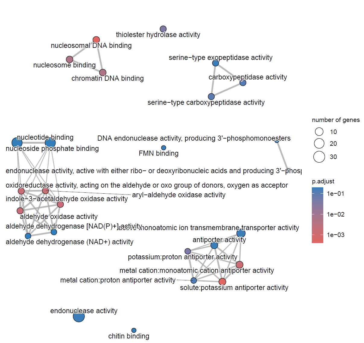 MF_ego <- pairwise_termsim(MF_ego) pdf("./功能富集/06.网络图.pdf",width = 8, height = 8) emapplot(MF_ego, cex.params = list(category_label = 0.8, line = 0.5)) + scale_fill_continuous(low = "#e06663", high = "#327eba", name = "p.adjust", guide = guide_colorbar(reverse = TRUE, order=2), trans='log10') dev.off()